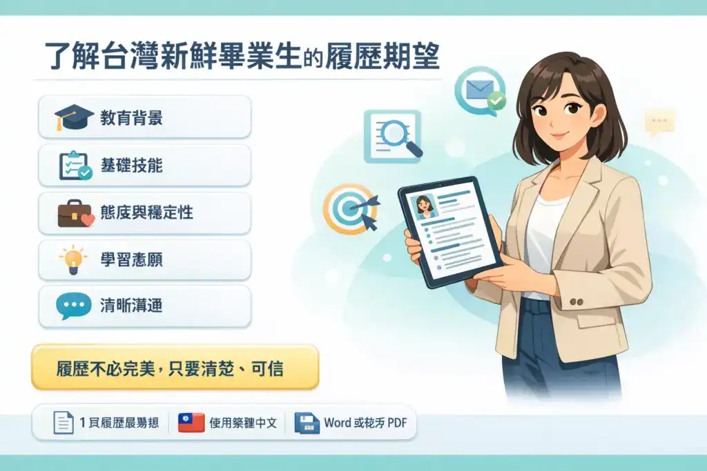 當我與台灣的新鮮畢業生合作時,我一再聽到相同的擔憂:「我沒有經驗。我的履歷該放什麼?」這種擔心完全正常。大多數台灣雇主理解新畢業生仍在學習。他們真正想要的是顯示清晰、誠實,以及基本工作準備度的履歷。 本指南是為了幫助台灣的新鮮畢業生打造符合本地招聘標準的履歷,而不是海外規則。我將一步步引導你正確的履歷格式、雇主期望看到的內容、如何撰寫每個區塊,以及即使經驗很少或沒有經驗時如何呈現自己。本指南實用且逐步撰寫,讓你能自信跟隨。