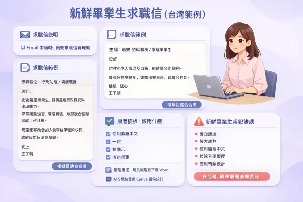 以 email 申請時,簡短求職信有幫助。 求職信範例(應屆畢業生) 應徵職位:行政助理 / 初級職務 您好, 我為應屆畢業生,具備基礎行政與資料處理能力。學習態度認真,溝通清楚,願意配合團隊完成工作任務。 期望能有機會加入貴單位學習與成長,感謝您的時間與審閱。 敬上 王子晴 這封信禮貌且適合台灣。