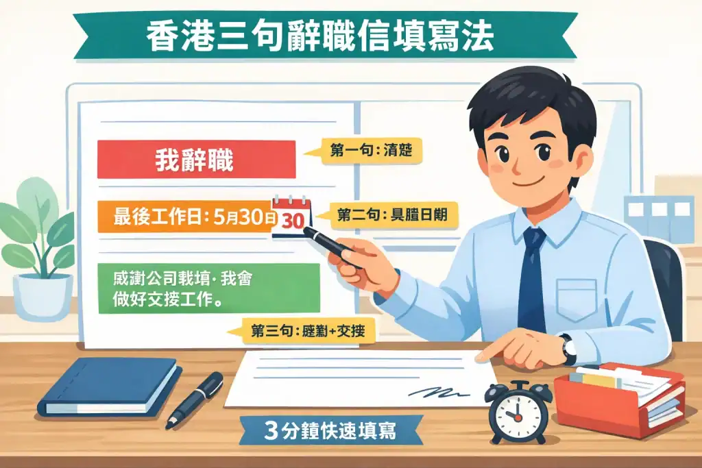 如果你正在搜尋「香港3句簡短辭職信」,你多半已經做咗決定,只係唔想喺「要點寫先正式?日期會唔會寫錯?會唔會寫多咗惹麻煩?」呢啲細節上浪費時間。我寫呢篇文章嘅目的好簡單:我想你用最短時間,寫出一封香港職場安全、得體、清楚、可即用的三句辭職信——你可以用中文、英文,甚至直接用Email/WhatsApp提交。