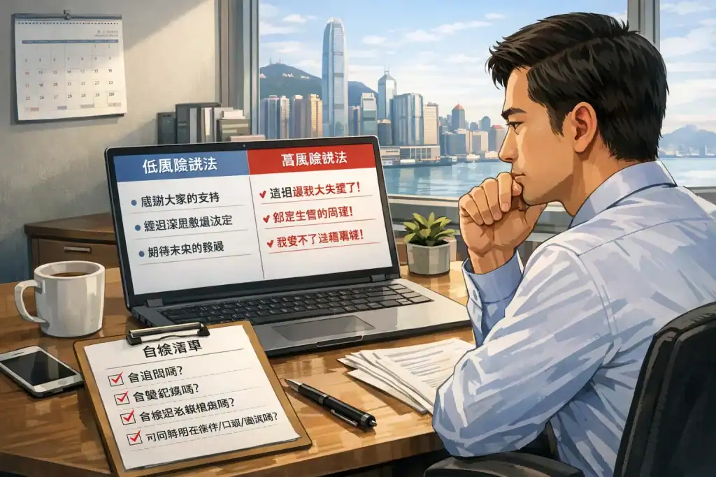 - 低風險說法:簡短、中性、向前看、留空間