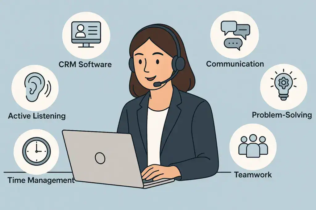 Key skills include communication, problem-solving, time management, attention to detail, and customer support tools (e.g., CRM systems or POS systems).
