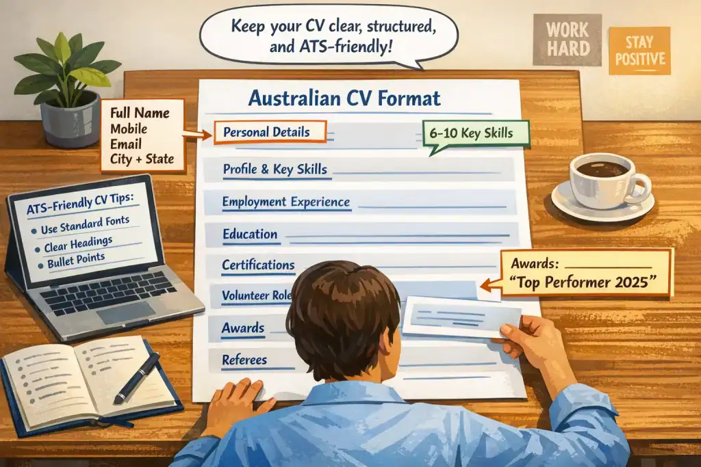A strong Australia CV format follows a predictable order. That’s good. Recruiters like predictable. ATS likes predictable too.